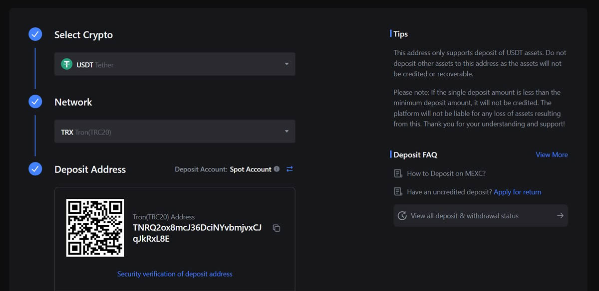 如果您已在其他交易所或钱袋中持有加密货币,可以将其转入您的 MEXC 账户。具体操作如下: