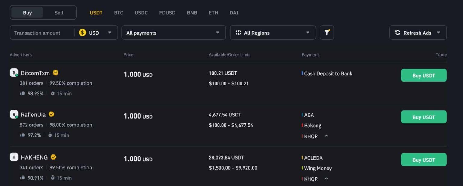 币安是提供定制服务的最佳 P2P 加密货币交易所之一。如果您是有特殊需求的买家,这一点尤其重要。在初始搜索过程中,您需要输入所需的货币、付款方式和国家/地区。买家可以选择比特币、以太坊、BNB、Dai、USDC、FDUSD 和 USDT;并且币安始终提供充足的流动性。