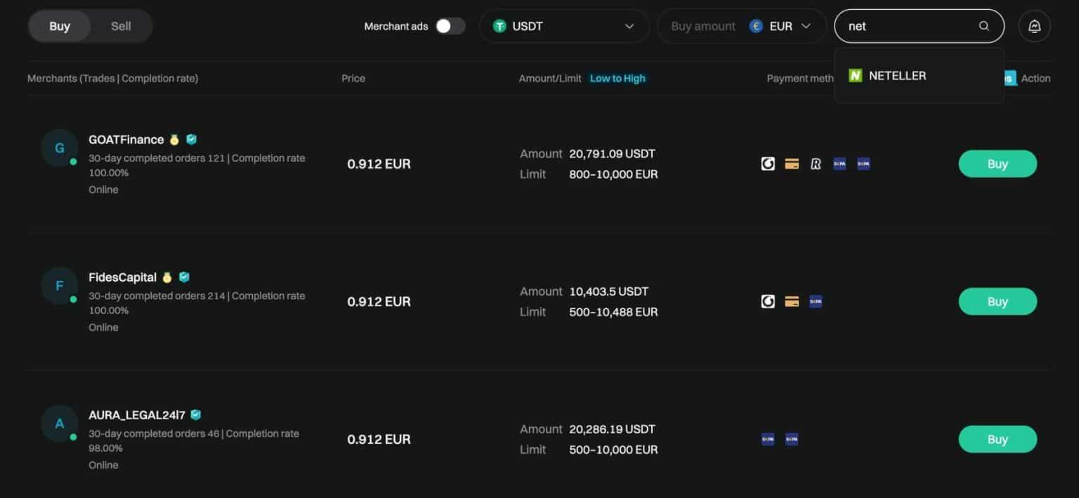 付款方式包括 Skrill 和 Neteller 等电子钱袋以及本地银航转账。此外,Revolut 和 Wise 等银航也支持使用 Bitget,这是一个特殊优势。然而,我们发现大多数 P2P 交易的最低订单要求很高。很多情况下,最低订单金额至少为 500 美元,因此 Bitget 并不推荐普通交易者使用。