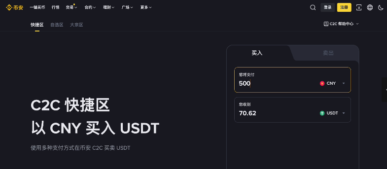 1、进入到币安APP(官方下载)之后,点击上方的【添加资金】,选择【C2C交易】。