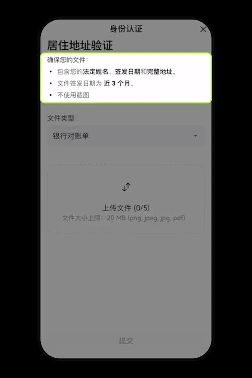 请确保文件签发至您的实名姓名,并包含您当前完整的居住地址;文件必须是最近 3 个月内签发;文件四边四角应清晰可见,不得有任何裁剪;仅接受纸本文件拍摄照片或 PDF 数字格式,照片翻拍,手写字体或屏幕截图不予接受。注:请您在提交前确保文件满足“认证注意事项”的要求,不符合要求的文件将无法作为有效认证资料。另外,您可通过《我如何提交我的地址证明(POA)?》了解居住地址证明文件范例。