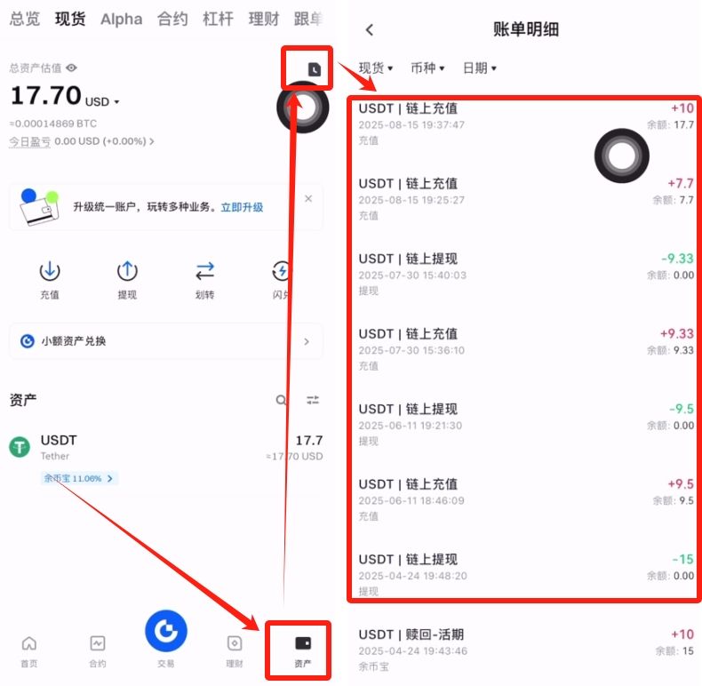 你可以在【资产】这里,点击上方这个小钟表的标志,在这里就可以看到我们每笔交易的账单明细了。