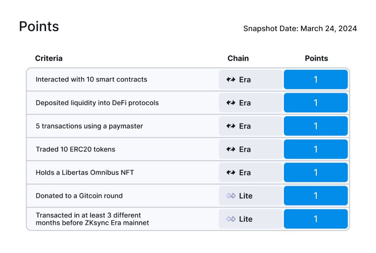1.用户(89%):在ZKsync 上进行交易并达到活动门槛的ZKsync 用户。简单来说,每个地址必须至少有一个积分才有资格获得空投。具体点数分配如下图所示: