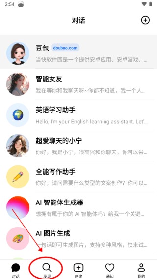 2、在发现页面,点击搜索栏,输入想要的AI智能体