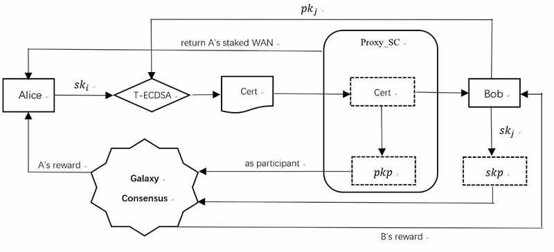 Wanchain 采用权益证明 (PoS) 共识机制与 Galaxy Consensus(委托权益证明 (DPoS) 的一种变体)相结合,即使用户只持有少量 WAN 代币也可以进行质押。