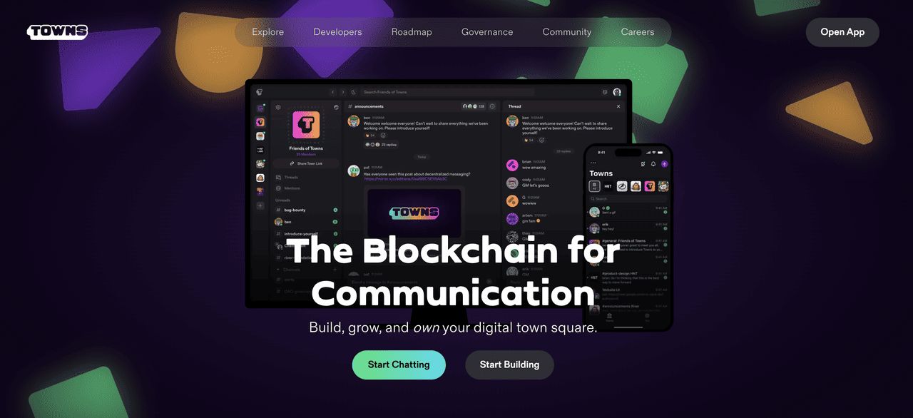 Towns 协议(TOWNS)是一个开源平台,重新构想了线上通讯,让社群能够完全拥有他们的数字空间。用户不再依赖集中式平台,而是可以创建他们真正控制、治理和货币化的空间(Towns)。