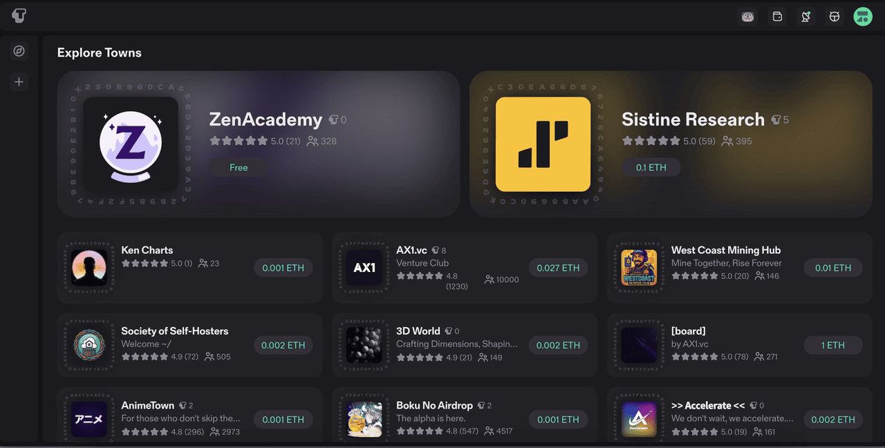 城镇(空间)是生态系统的中心。它们像是Discord 或Slack 的增强版,但有一个关键的区别:你实际上拥有它们。每个城镇(空间)是: