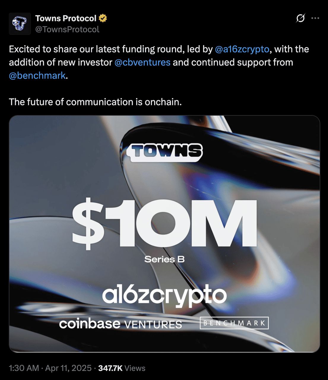 Towns Protocol 由Towns 应用程式背后的团队所建立,团队由Houseparty 和Meerkat 的共同创办人Ben Rubin 领导。该团队拥有扩展病毒式社交产品的经验,并在多轮融资中获得了3991 万美元的资金。这包括由Andreessen Horowitz (a16z crypto) 主导的2550 万美元A 轮以及1000 万美元B 轮融资,还有来自Coinbase Ventures、Benchmark、Union Square Ventures 和其他知名投资者的策略性参与。这一支持显示出对Towns 在重新定义社群如何在线互动的愿景的强大信心。