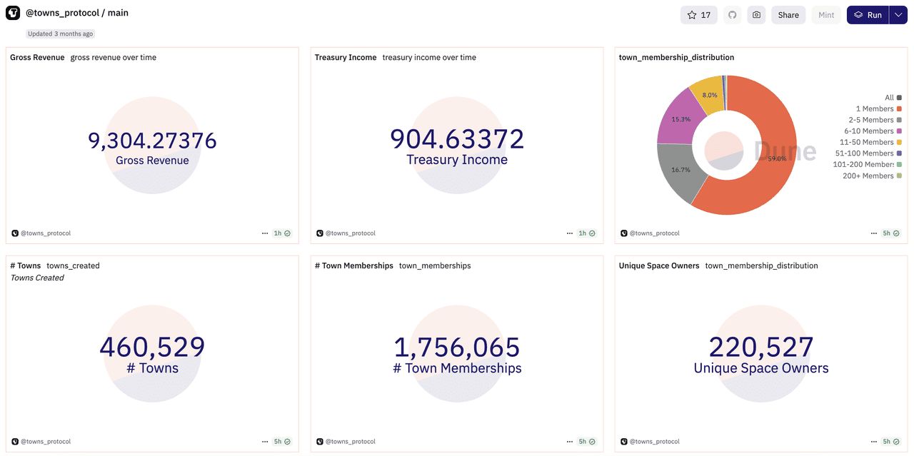 用户采用指标显示,Towns 不仅仅是一个想法,而是正在积极成长的生态系统。 Towns 上有超过170 万会员,分布在46 万个创建的Towns 中,其中22 万名独立空间所有者推动了参与。基于Towns 建立的社群已经创造了930 万美元的总收入,并持续稳步增长。这一势头反映出市场对结合拥有权、隐私和经济参与的平台有明确需求,这使Towns 成为去中心化通信中最有前景的项目之一。