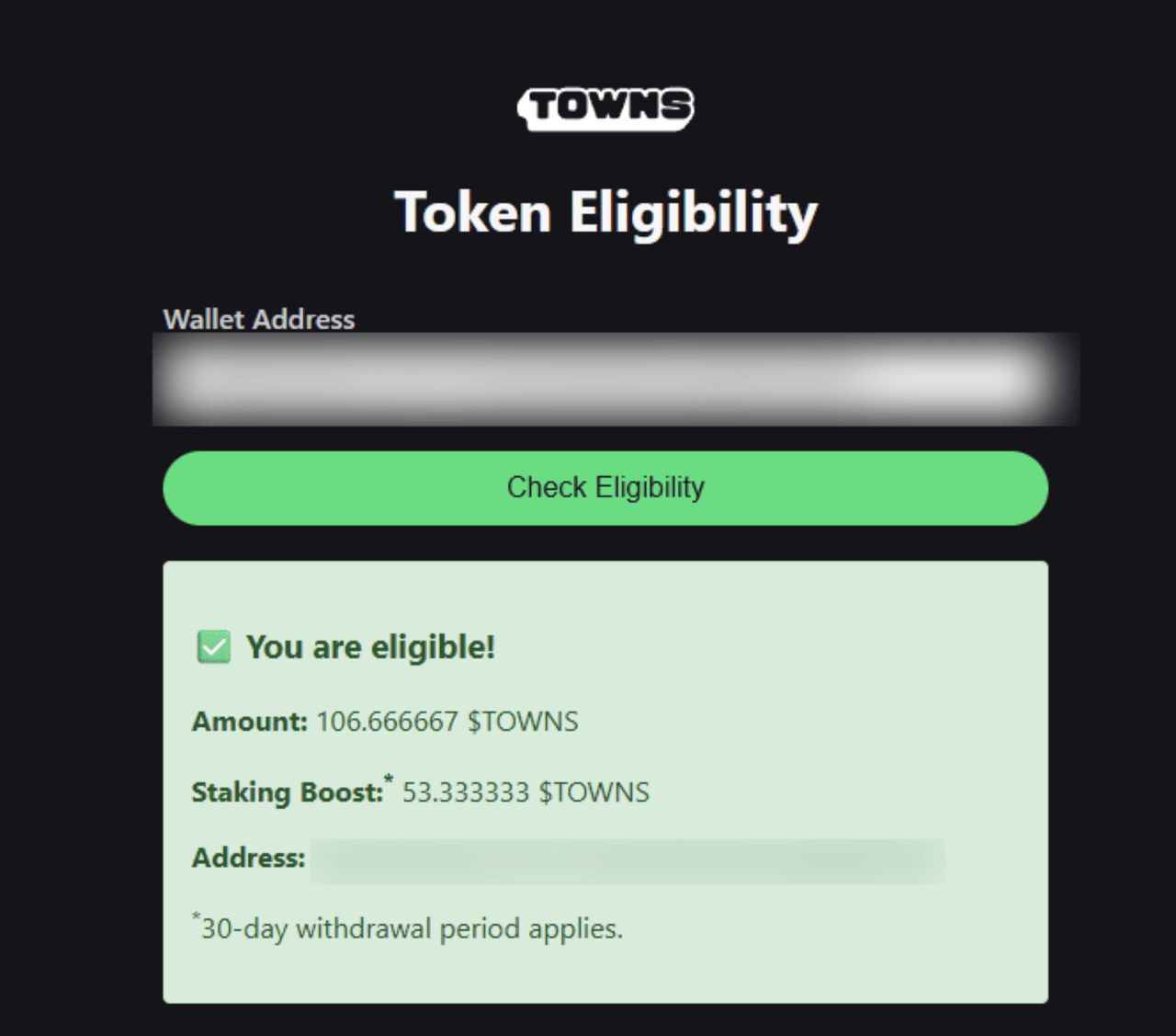 系统将验证您的钱袋是否符合空投资格。如果符合资格,您将看到分配给您的$TOWNS 数量。如果不符合资格,讯息将立即告诉您。