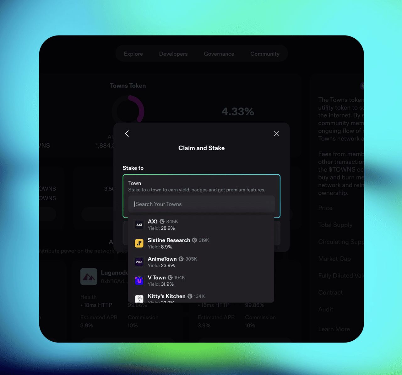 领取您的$TOWNS 代币非常简单。符合条件的用户还将有选项在领取过程中直接将代币质押到他们最喜爱的Town (Space),以解锁特殊功能和未来奖勋。