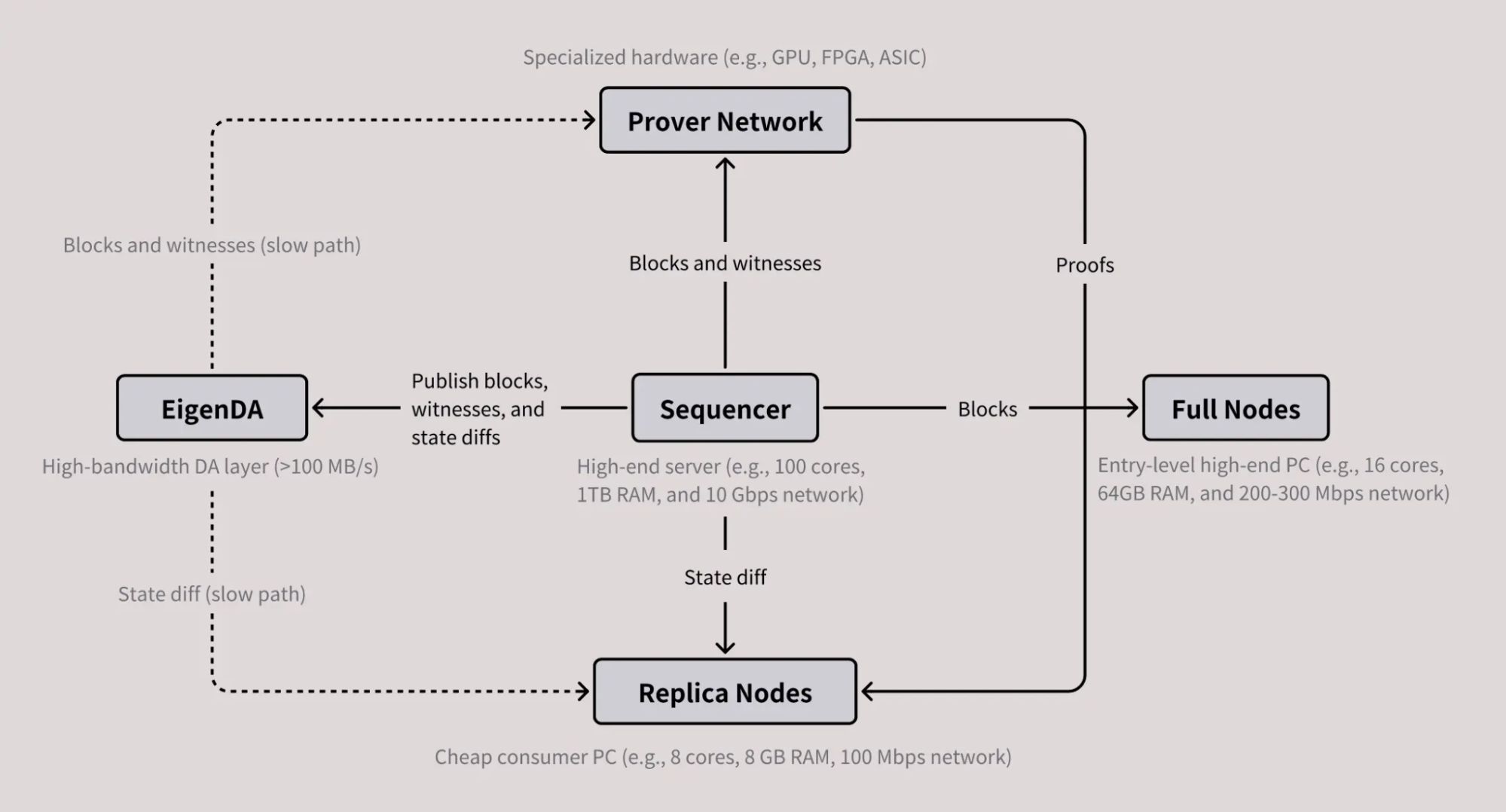 证明者(Prover)节点:异步生成加密证明(如 ZK 证明),无需访问完整状态,有效提高效率。