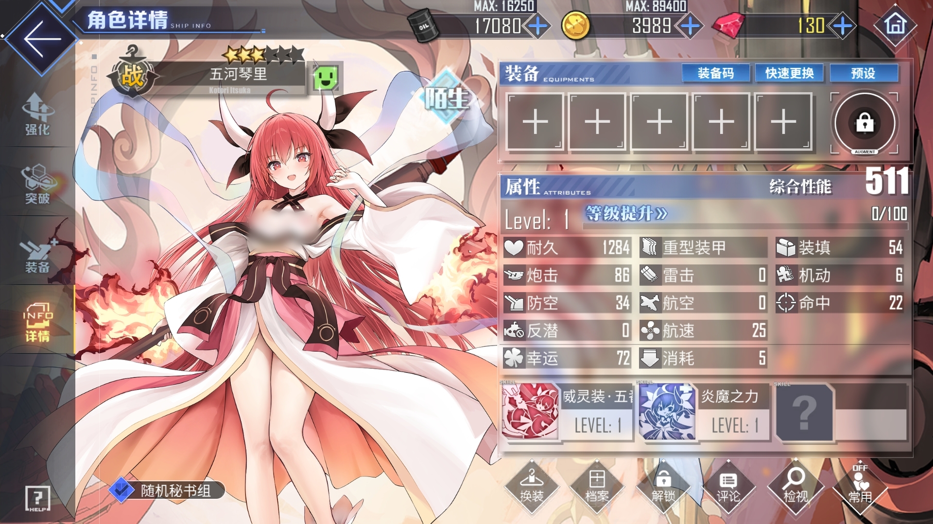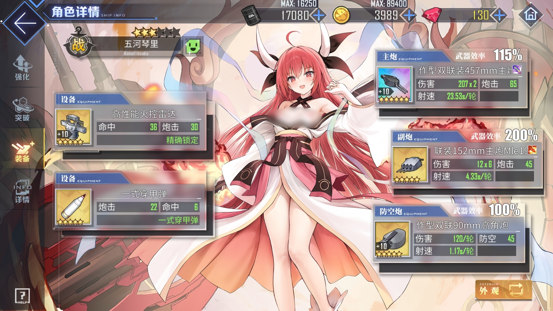 4、在装备了专属兵装后,炎魔之力技能还能进化,可提升五河琴里自身的炮击值和防空效果,更能在触发致命伤回避后为自己回复耐久。