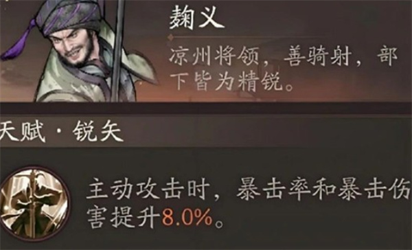 鞠义:锐矢天赋在主将攻击时提升8%暴击率与暴击伤害。