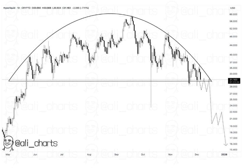 当Ali Martinez指出HYPE日线图正在形成圆弧顶形态后,技术情绪转向谨慎。其分析显示价格自10月峰值持续缓步下行,目前该结构正接近29-30美元支撑带。若颈线失守,Ali预测理论下跌目标位在16美元附近,强调多头需守住当前价位以避免深度回撤。