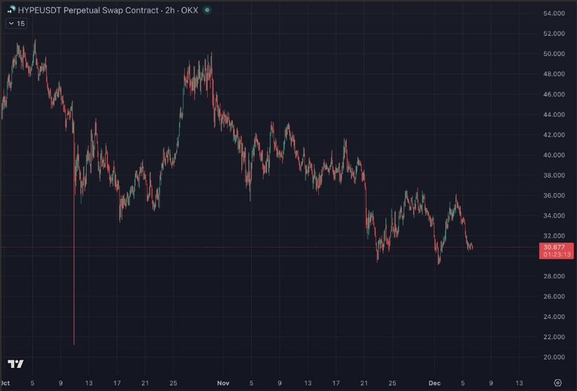 经历一周剧烈波动后,HYPE正试图在30美元关口上方企稳,该价位在整个11月及12月初多次成为短期平衡点。尽管市场整体存在不确定性,但HYPE在该区域展现出韧性,从周末触及的日内低点小幅回升。