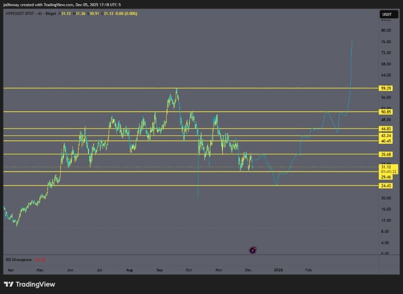 其分析认为只有当HYPE长期维持在30美元下方才算结构破坏。只要周线支撑有效,冲击38-40美元区间仍具可行性,尤其在市场出现反转前的流动性清洗之后。