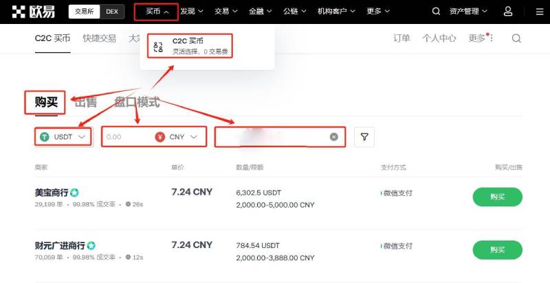 9、进行交易前需要拥有USDT,可在C2C买币进行交易,根据需求选择合适商家,点击“购买”,而后根据提示进行付款、等待商家放币(若是长时间没有收到币种,可联系客服进行处理)