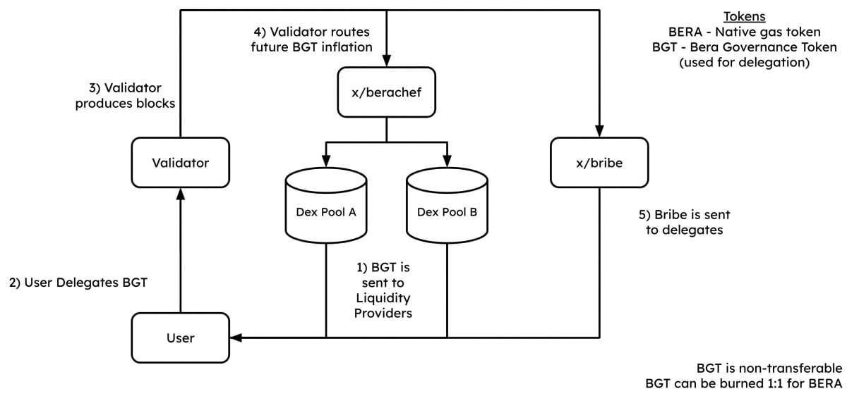 质押和流动性:验证者必须质押 $BERA 来保护链的安全,并通过向奖励库输送流动性来获得奖励。治理代币:流动性提供者可以通过提供流动性来赚取不可转让的治理代币 $BGT,并将其委托给验证者以增加奖励。协作增长:该系统协调了验证者和协议之间的激励机制,从而促进了流动性和网络安全。