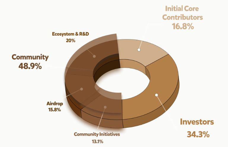 具体来说,在 48.9% 的资金中,15.8% 将用于空投(免费分发),13.1% 将用于其他社区活动,20% 将用于生态系统发展基金以支持开发者。