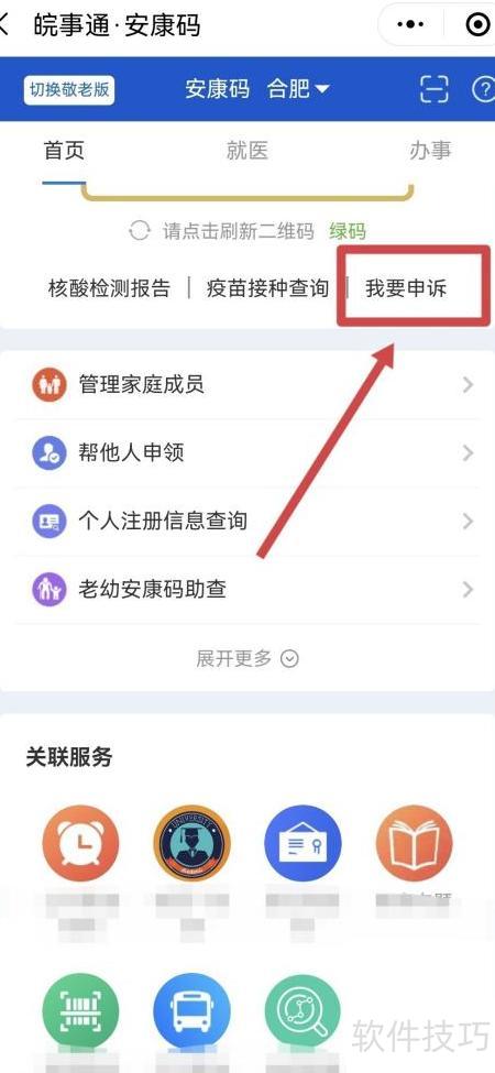 - 打开皖事通应用或小程序,进入健康码页面后点击下方的我要申诉选项。