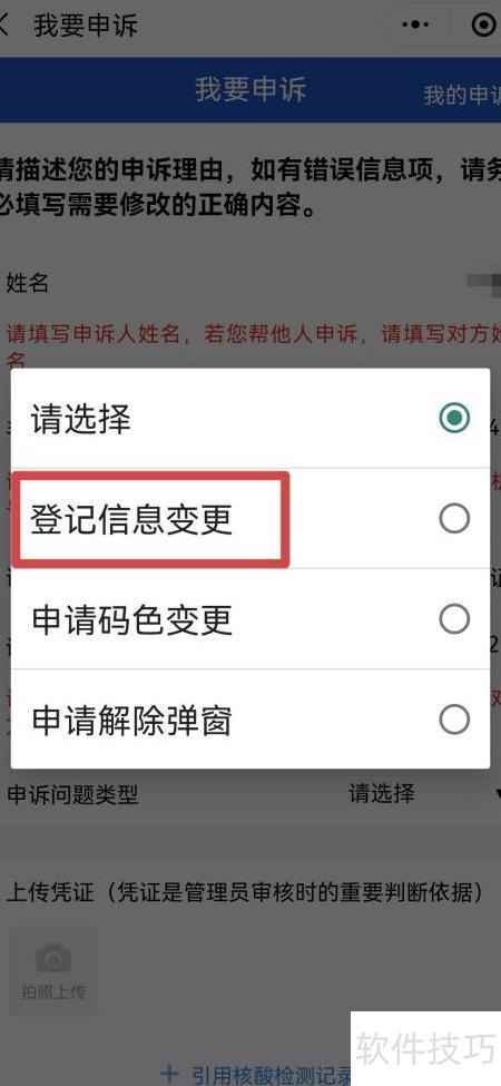 - 按需选择错误信息,填写更正内容并上传相应证明材料。