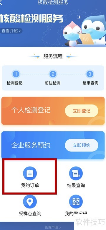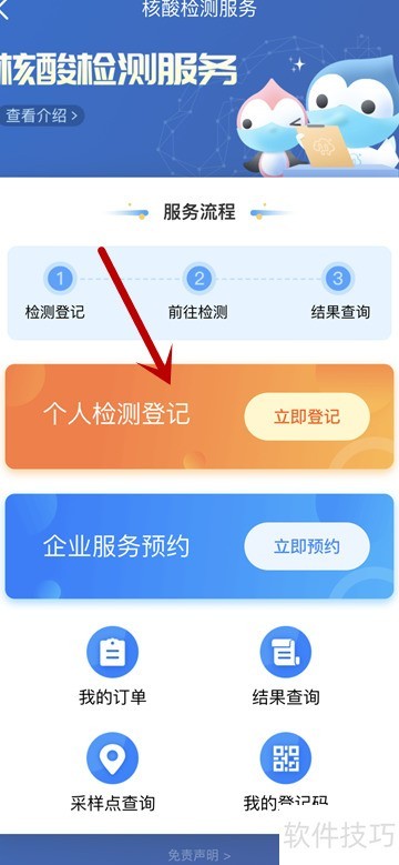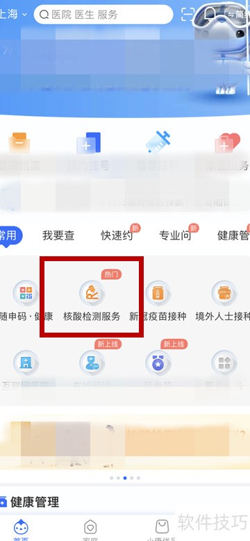 - 打开健康云应用,用手机号注册登录后,选择页面上的核酸检测服务功能。