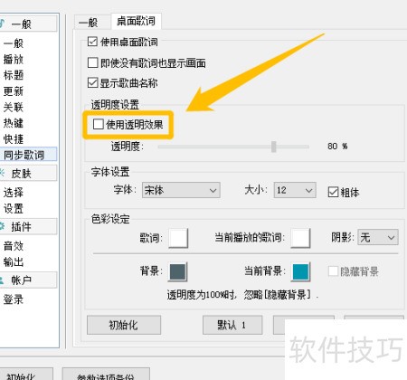- 进入一般设置中的同步歌词,开启桌面歌词菜单里的使用透明效果功能开关。