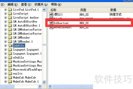 点击 HKEY_CLASSES_ROOT 下的 lnkfile 项;如果找不到,请用查找功能定位;接着删除 IsShortcut 的项值。