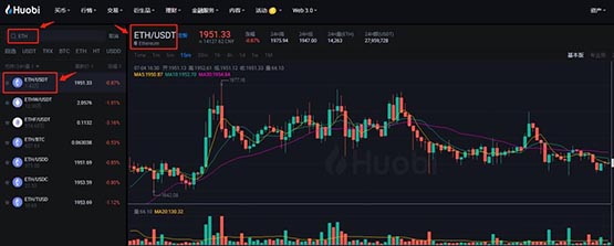 5、在左侧搜索栏输入币种简称【ETH】,选择【ETH/USDT】交易对。