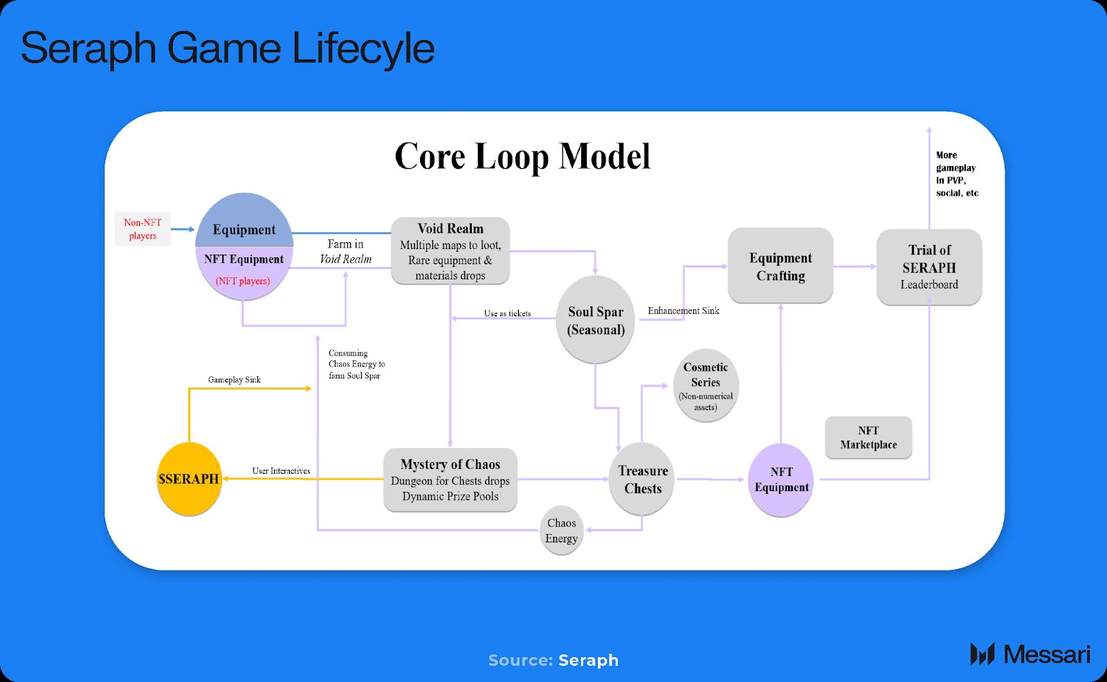 一部分代币供应量将用于玩家奖励,并通过一个“用户互动”系统在每个赛季进行分配(如上图中的核心循环模型所示),该系统根据玩家的行为和活动量化互动。SERAPH旨在用于解锁功能、制作物品,并促进玩家在游戏中的参与。为了进一步增加SERAPH的实用性,它还将用于: