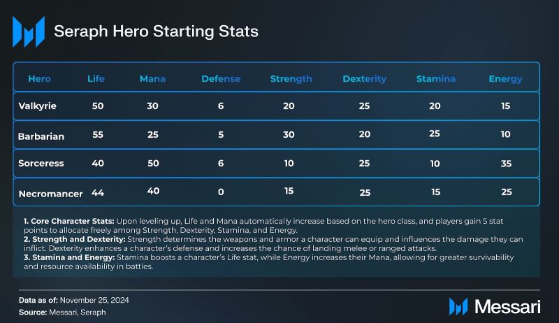 在Seraph中,玩家需要在四个主要角色中选择一个开始冒险,而第五个角色德鲁伊正在开发中:(i)女武神擅长使用弓和矛进行远程攻击;(ii)野蛮人拥有强大的力量和耐力,擅长近战;(iii)女巫专注于魔法,能操控冰霜、火焰和闪电三种元素;(iv)死灵法师能指挥不死生物并施加诅咒。