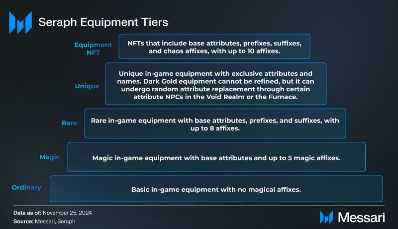 Seraph拥有丰富的装备系统,玩家可以充分利用。每个玩家有十个槽位供选择:左手武器、右手武器、项链、两个戒指、头盔、盔甲、腰带、手套和鞋子。每个装备物品分为不同等级: