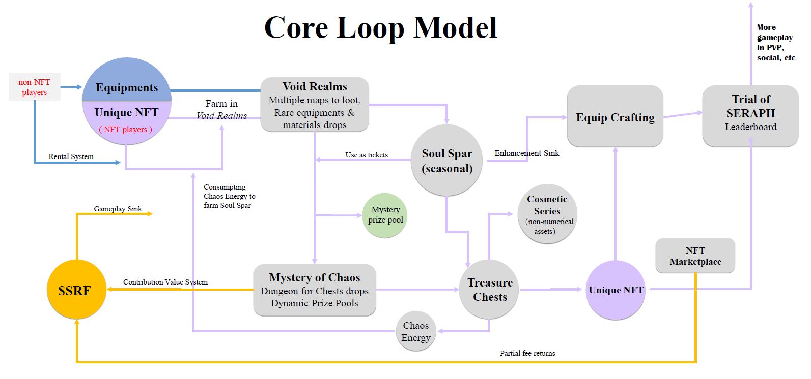 $SRF代币:$SRF代币是Seraph经济模型的核心,玩家可以使用该代币进行装备升级、解锁特殊游戏模式以及参与社区投票等多种活动。NFT集成:玩家可以获得代表装备及其他资产的独特NFT,进一步提升游戏体验。这些NFT可以在游戏内市场上进行交易,推动经济流动。虚空领域与装备获取:玩家可进入名为“虚空领域”的不同地图,在这里采集稀有装备和材料。这不仅增加了探索元素,还促进了经济交易,玩家通过寻找更强装备与其他玩家交换、交易。灵魂碎片与混沌能量:玩家通过消耗混沌能量来收集灵魂碎片,这些季节性资源可用于多种增强,或者进入“混沌谜境”地下城,开启动态奖池,获得丰厚奖励。宝箱与外观物品:玩家可以使用$SRF代币开启宝箱,获取高价值NFT及外观物品等非数值资产,这些物品将为玩家的个人库存增添更多选择和价值。贡献与奖励系统:“贡献挖旷”机制让玩家通过游戏进程、资产积累和参与活动等方式为游戏生态做出贡献,从而获得$SRF代币。经济流动与消耗机制:Seraph设计了多种经济流转机制,如装备打造与强化,以调节$SRF代币的流动,保证游戏内经济的平衡与稳定。