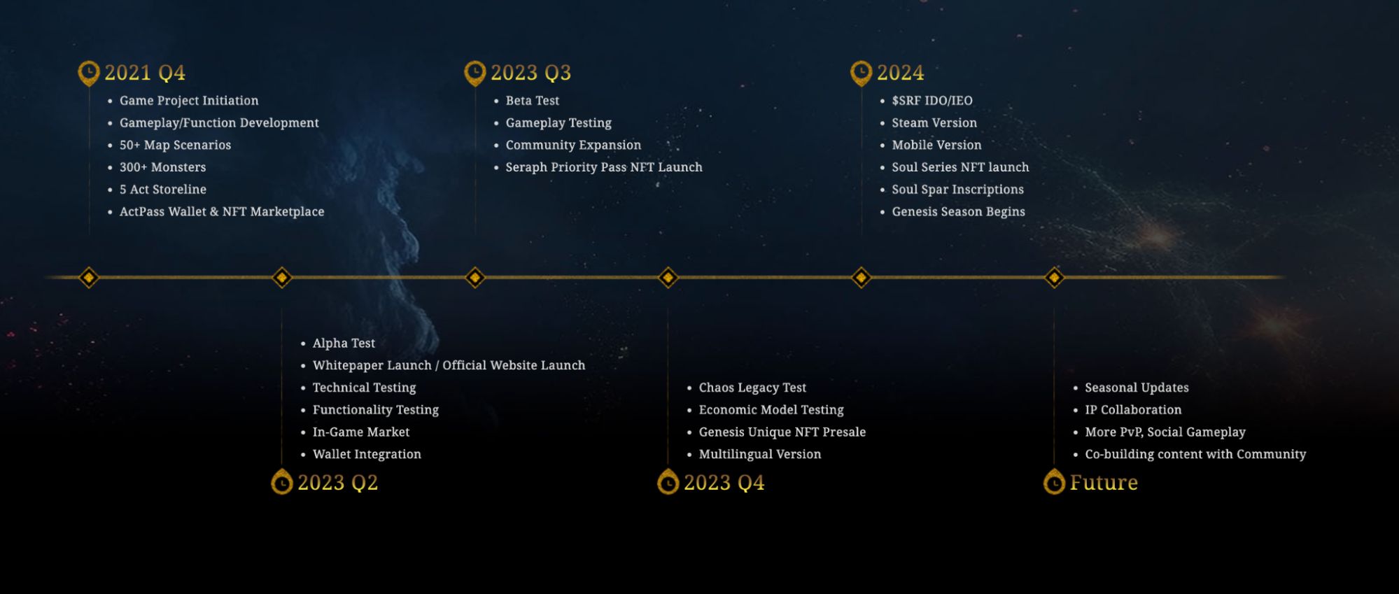 Seraph的开发路线图内容丰富,涵盖了从游戏项目初步设立到游戏玩法与功能的不断完善。计划中包括超过50个地图场景、300种怪物类型以及五幕式的剧情框架。此外,路线图还涉及一些技术集成,如ActPass钱袋和NFT市场等。