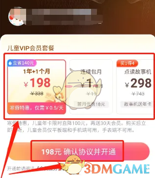 - 进入会员中心,选择儿童VIP会员套餐,点击【198元确认协议并开通】。