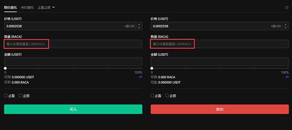 6.填写购买数量,点击买入,若是卖出,填写卖出量,点击卖出即可。(注意:RACA的最小交易数量是1000RACA)