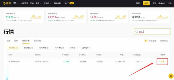 第三步:点击AVAX币右侧的交易
