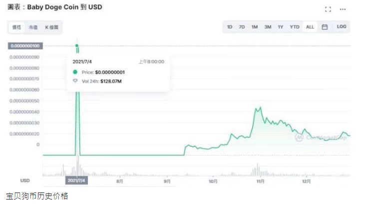 在次期间,宝贝狗币的价格水涨船高。在7 月4 号达到高点0.00000007 美元,而后开始下跌,至2021 年9 月才开始有所上涨。