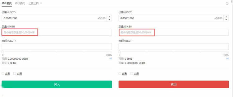 第五步:填写购买数量,点击买入,若是卖出,填写卖出量,点击卖出即可。注意:SHIB最小交易数量是50000SHIB