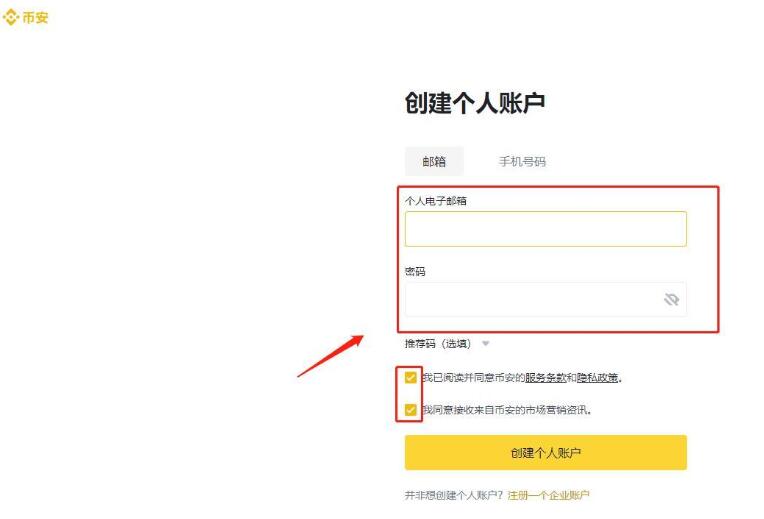 2、选择【邮箱】,输入您的个人电子邮箱,然后为您的账户创建一个安全密码,记得勾选“服务条款和隐私法规”。