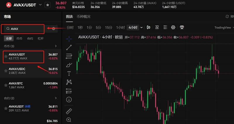 11、在搜索框输入AVAX,选择AVAX/USDT交易对,可以看到AVAX实时行情