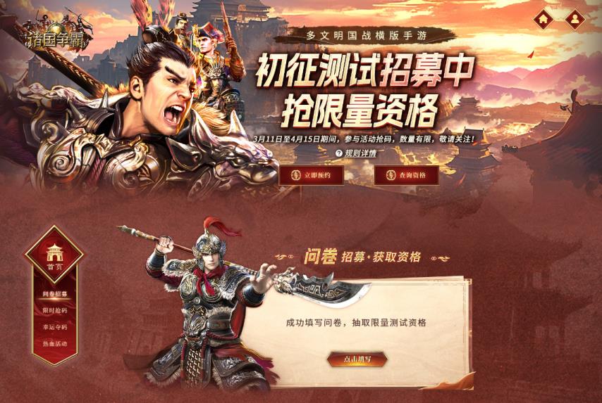 本次《诸国争霸》“初征首测”为限量删档不计费测试,仅限安卓用户参与,开启时间为3月25日11:00至4月15日18:00。主君们可前往官网参与招募活动,通过【问卷招募】、【准点抢码】、【幸运抽奖】以及【累计签到】等丰富多样的方式,获得测试资格与众多好礼,抢占先机,预备出征!诚邀大家加入本次测试,体验独特恢弘的多文明设定,横向战斗、攻城略地等玩法乐趣,还有角色随心养成与创新的士兵捕捉等特色机制亟待解锁!