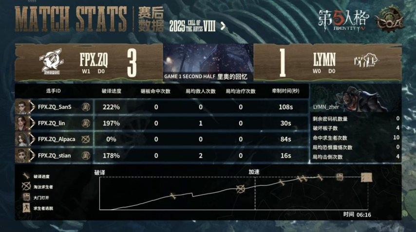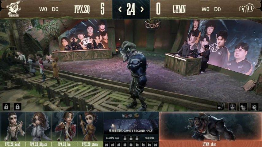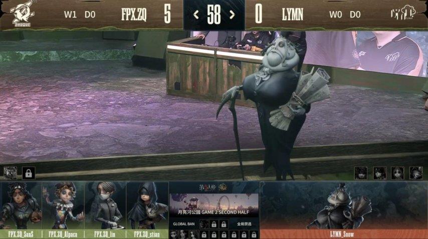 FPX.ZQ的求生者选择了教授、“心理学家”、大副、空军;LYMN的监管者zher选择了“跛脚羊”。(BAN先知、机械师、木偶师、古董商)