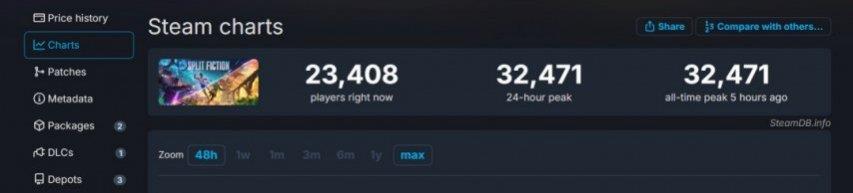 根据SteamDB反馈,《双影奇境》Steam首发在线峰值为32471人,当前在线23408人。