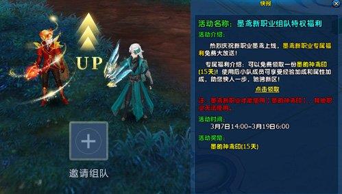 机关启封,全民狂欢!新服上线即送20000金券,兑换海量珍稀道具;额外解锁金券礼包可获三档宝石、道具等超值资源,收集“墨”“鸢”“降”“世”四字卡片,可兑换兑换各式稀有奖励!包含墨鸢尊享礼包、墨鸢庆典礼包,以及时装坐骑等稀有奖励,打造专属墨家传人形象!与新职业墨鸢组队即可获得经验加成+5%、全属性+20。赶紧组上你的新职业好友一起驰骋新区吧!