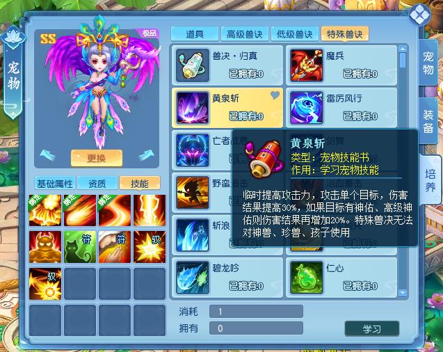 在兽诀相关的两个选项卡里,少侠可以快捷地给宠物打各种技能书。你不需要提前购买好技能书,而是可以在这个页面直接购买并学习,省去了繁琐的过程。宠物打书是培养的重中之重,不可不察呀!