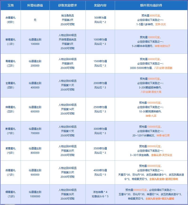 玩家在新服角色抢注期间注册角色和进行预充值都可以获得仙道值,在开服后根据累积的仙道值可以激活不同档次的九霄星礼。