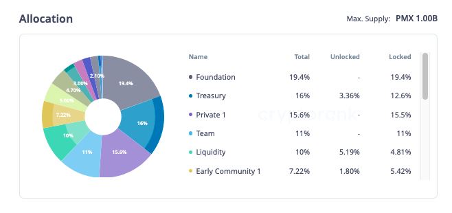 PMX 代币的总供应量为 1,000,000,000 枚。代币的分配方式包括公开和私人销售配额,以及其他用途。例如,2022 年 2 月的种子轮中,分配了 143,000,000 枚 PMX,售价为每枚 $0.04,筹集资金 572 万美元。之后的公开销售中,代币的配额和价格有所变化。