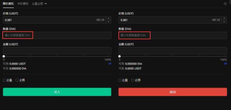 6.填写DIA购买数量,点击买入,若是卖出,填写DIA卖出量,点击卖出即可。注意:DIA最小交易数量是1DIA